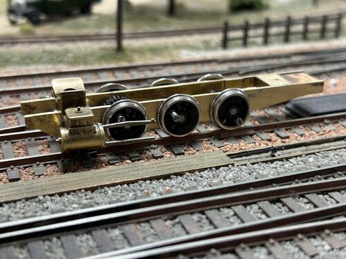 台枠を組み立てました。動輪にはまだ軸箱が入っていませんが、台枠を乗せてみました。バルブロッドを動かすかどうか、クランク半径が大きいので、ちょっと厳しいかもしれません。